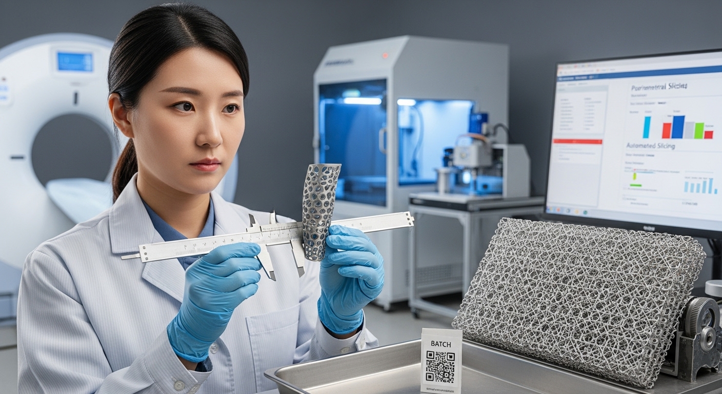 1) 환자 데이터 수집 및 3D 모델 생성 → 2) DFAM 기반 설계 수정 → 3) 슬라이싱 및 생산 지시 → 4) 출력(산업용 SLS/SLM 등) → 5) 세척·후처리·열처리 → 6) 품질 검사(치수, 기계적 성능, CT 검사) → 7) 포장 및 납품. 각 단계마다 디지털 이력 추적이 필수입니다.