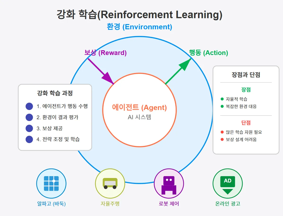 - 장점: 자율적 학습이 가능하며, 인간이 직접 프로그램하지 않아도 최적의 솔루션을 찾을 수 있음.