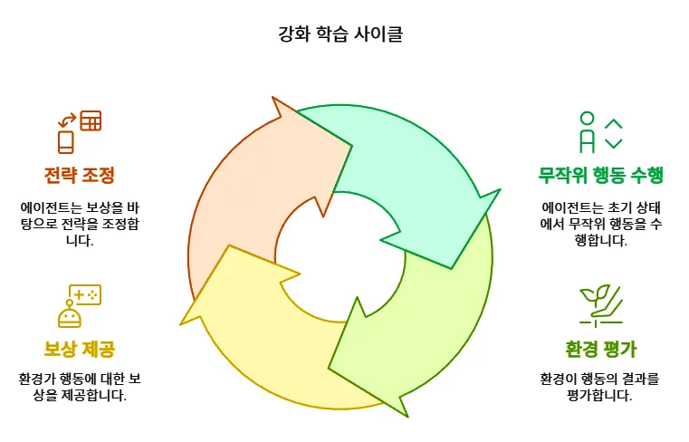 강화 학습은 단순한 개념이지만, 실제로 작동하는 방식은 여러 단계로 이루어집니다. 다음은 강화 학습이 진행되는 일반적인 과정입니다.