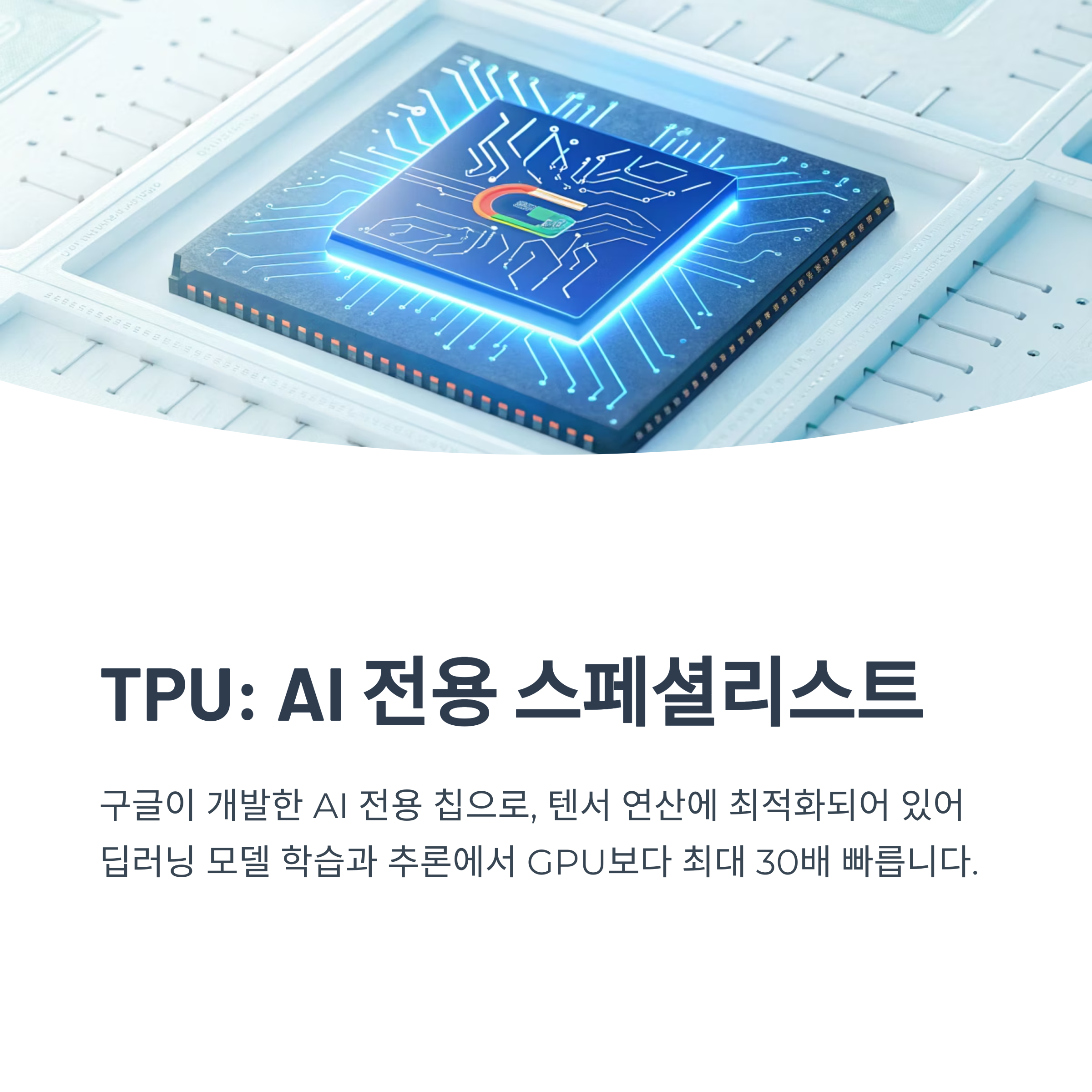 CPU가 만능 일꾼, GPU가 병렬 처리 전문가라면, TPU(Tensor Processing Unit, 텐서 처리 장치)는 오직 AI 연산만을 위해 태어난 'AI 연산 특급 스페셜리스트'라고 할 수 있어요. 구글이 자체적으로 개발한 AI 맞춤형 반도체인데요, 이름에 들어간 '텐서(Tensor)'는 딥러닝에서 사용되는 핵심 데이터 구조를 의미합니다. 즉, TPU는 텐서 연산에 극도로 최적화되어 있어서, 특정 AI 작업, 특히 구글의 딥러닝 프레임워크인 텐서플로우(TensorFlow)를 사용할 때 GPU보다도 훨씬 높은 성능과 전력 효율을 보여줄 수 있습니다. 마치 특정 요리를 만들기 위해 특별히 제작된 전용 도구와 같다고 생각하시면 이해가 쉬울 거예요. 범용성은 다소 떨어질 수 있지만, 해당 작업에서는 타의 추종을 불허하는 성능을 내는 거죠. 구글은 자사의 검색, 번역, 포토 서비스 등 다양한 AI 기반 서비스에 TPU를 적극 활용하고 있고, 클라우드 서비스를 통해 개발자들에게도 TPU 사용 환경을 제공하고 있답니다. 그만큼 AI 시대에 특화된 연산 능력이 중요해졌다는 방증이겠죠.