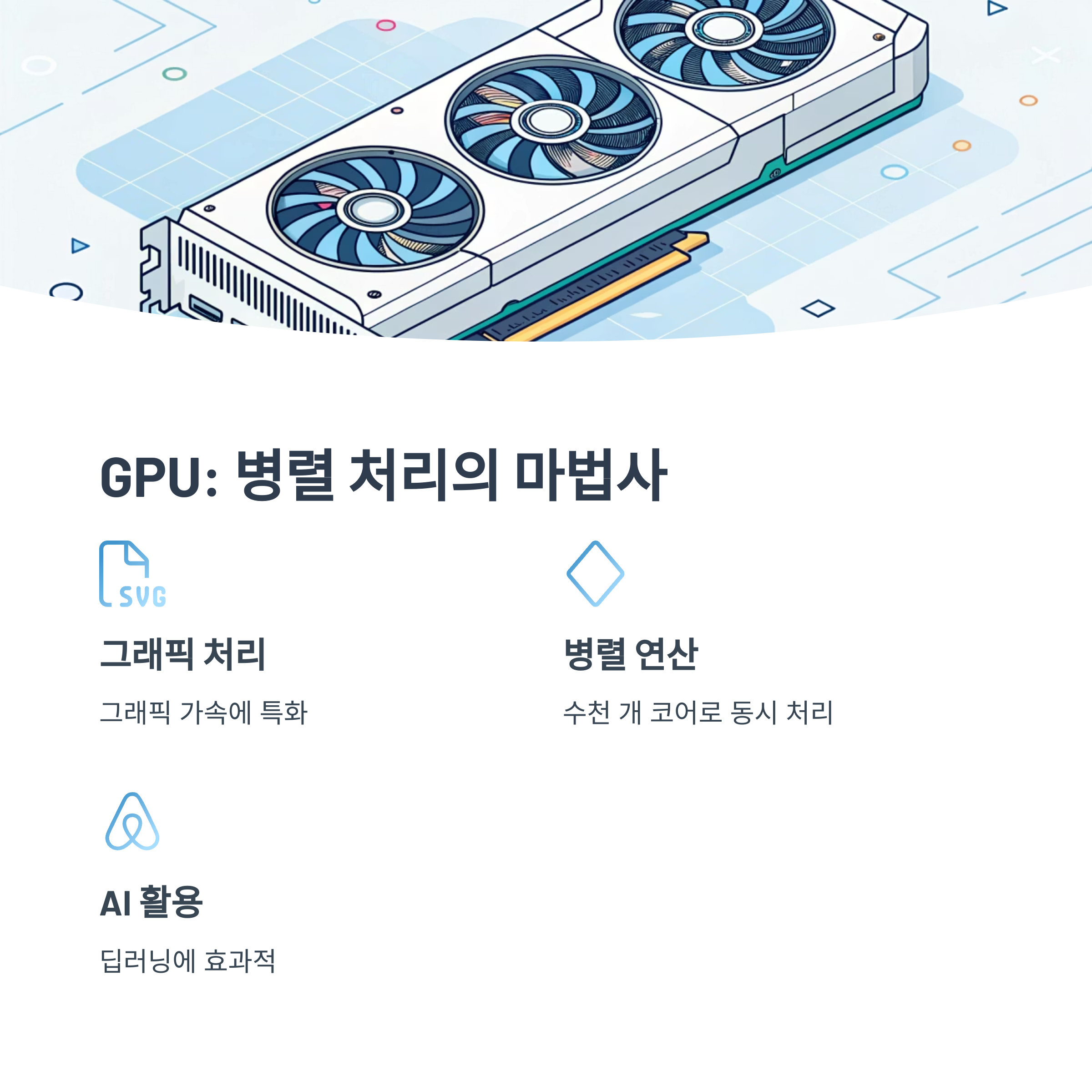 GPU(Graphics Processing Unit, 그래픽 처리 장치)는 원래 이름처럼 컴퓨터 그래픽을 처리하기 위해 탄생했어요. 우리가 즐기는 화려한 3D 게임이나 고화질 영상을 부드럽게 보여주는 역할을 하죠. 그런데 이 GPU가 AI 시대의 핵심 주역으로 떠오를 줄 누가 알았을까요? GPU의 가장 큰 특징은 수많은 작은 코어(수백~수천 개)를 가지고 있어서, 단순한 계산 작업을 동시에, 즉 병렬적으로 처리하는 데 매우 뛰어나다는 점입니다. 마치 수많은 일꾼이 각자 단순 작업을 동시에 해치우는 공장과 같아요. AI 모델 학습, 특히 딥러닝 분야에서는 행렬 곱셈과 같은 단순 연산이 대규모로 반복되는데, GPU의 이런 병렬 처리 능력이 여기에 딱 들어맞았던 거죠. CPU가 몇 명의 천재에게 어려운 문제를 맡기는 방식이라면, GPU는 수많은 보통 사람에게 쉬운 문제를 나눠주고 한꺼번에 해결하는 방식이라고 비유할 수 있겠네요.