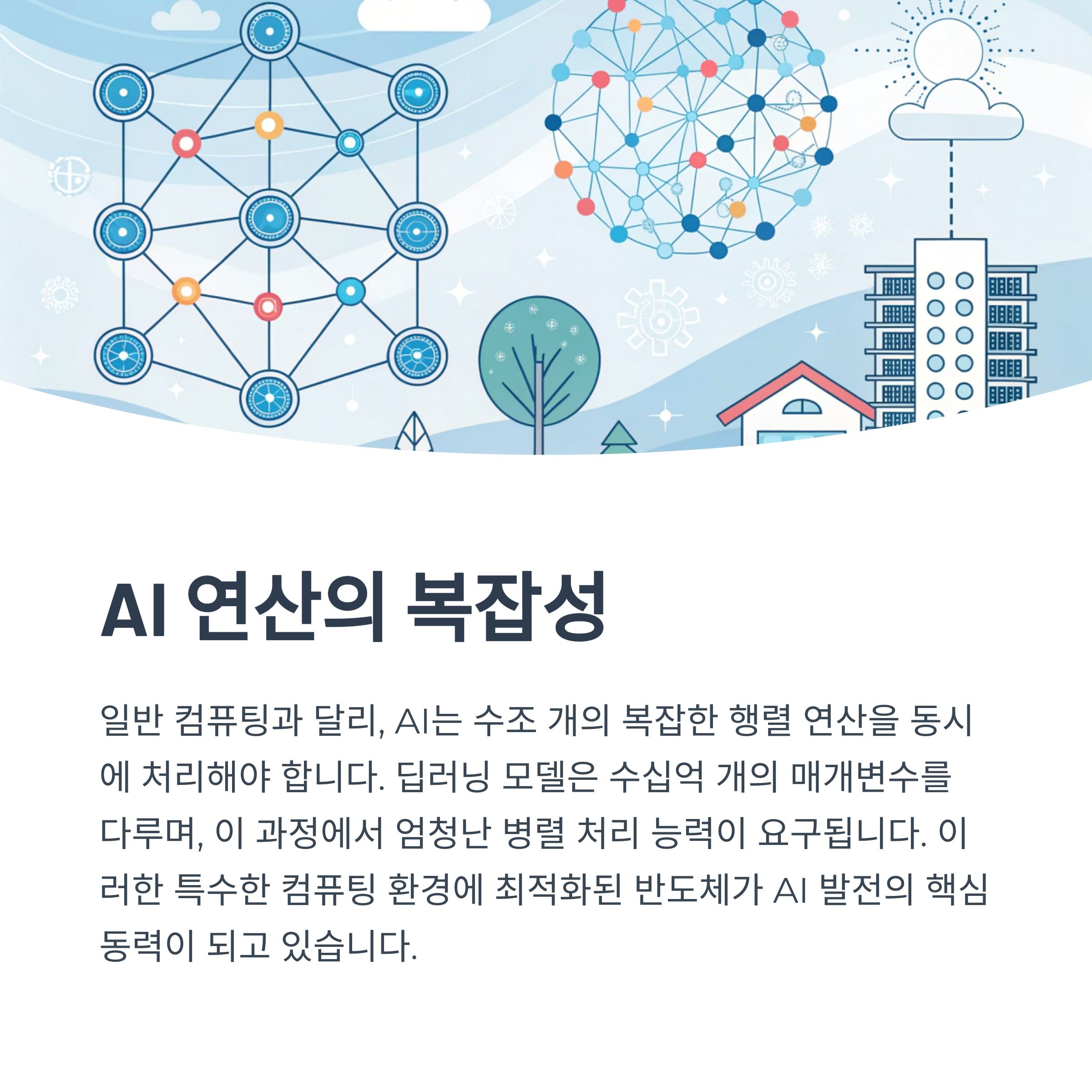 최근 몇 년 사이, 인공지능(AI)은 정말 우리 생활 깊숙이 파고들었어요. 스마트폰의 음성 비서부터 시작해서, 맞춤형 상품 추천, 자율주행 자동차 기술까지 AI가 안 쓰이는 곳을 찾기 어려울 정도죠. 그런데 이런 AI 기술이 실제로 똑똑하게 작동하려면 어마어마한 양의 데이터를 빠르고 효율적으로 처리해야 해요. 마치 사람이 복잡한 문제를 풀기 위해 두뇌를 쓰는 것처럼 말이죠. 예전에 제가 고사양 게임을 돌리려고 할 때 컴퓨터가 버벅거리던 기억이 나는데요, AI 연산은 이보다 훨씬 더 많은 계산을 필요로 합니다. 일반적인 컴퓨터의 뇌라고 할 수 있는 CPU만으로는 방대한 AI 모델을 학습시키고 운영하는 데 한계가 드러나기 시작했어요. 그래서 AI 연산에 특화된, 더 빠르고 효율적인 'AI 반도체'가 꼭 필요하게 된 것이랍니다. AI 반도체는 특정 작업, 예를 들어 딥러닝이나 머신러닝 같은 신경망 연산을 훨씬 효과적으로 처리할 수 있도록 설계되었거든요.