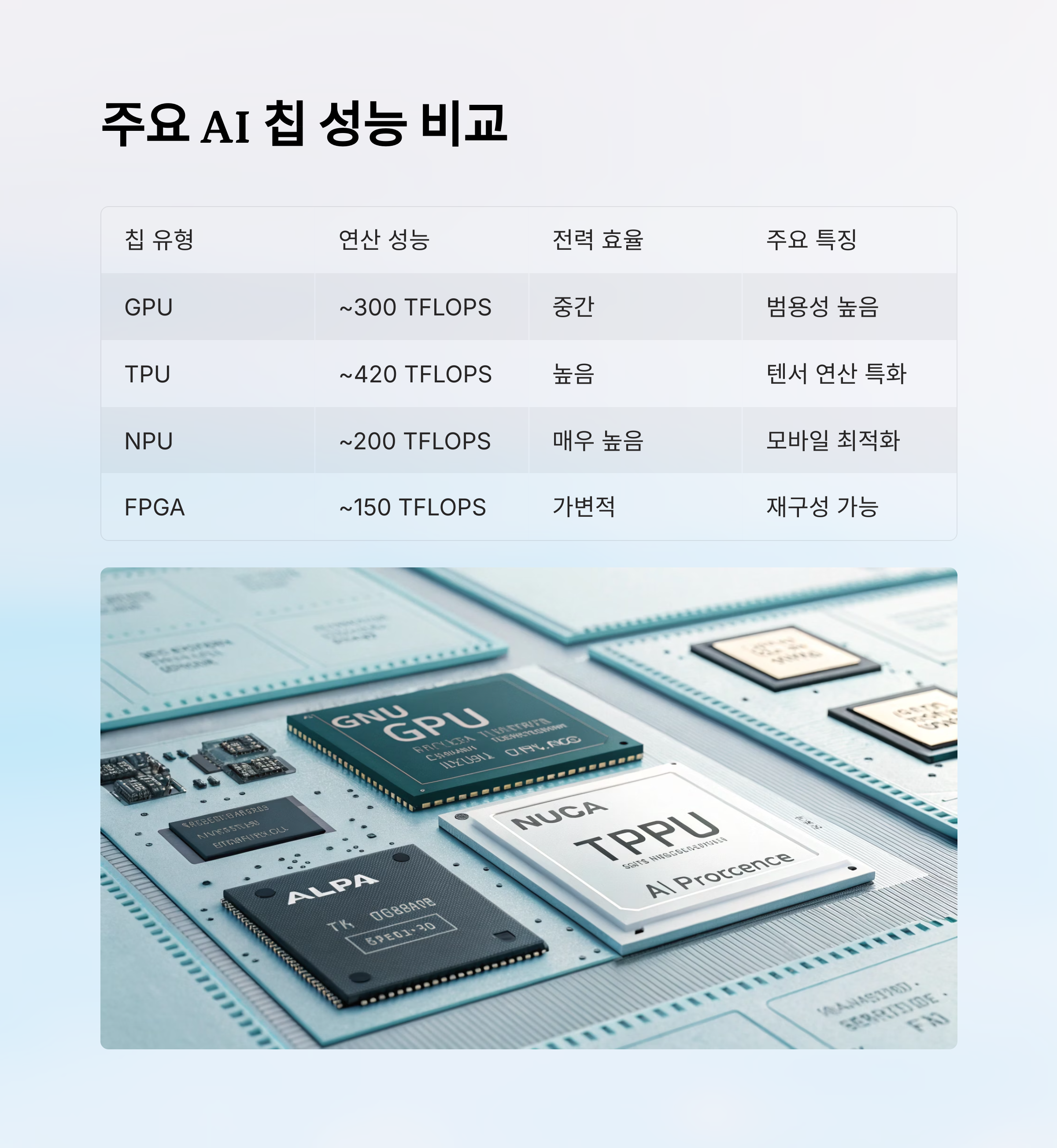 | 칩 종류 | 주요 특징 | 연산 성능(TFLOPS) | 전력 효율성 | 가격대(USD) |