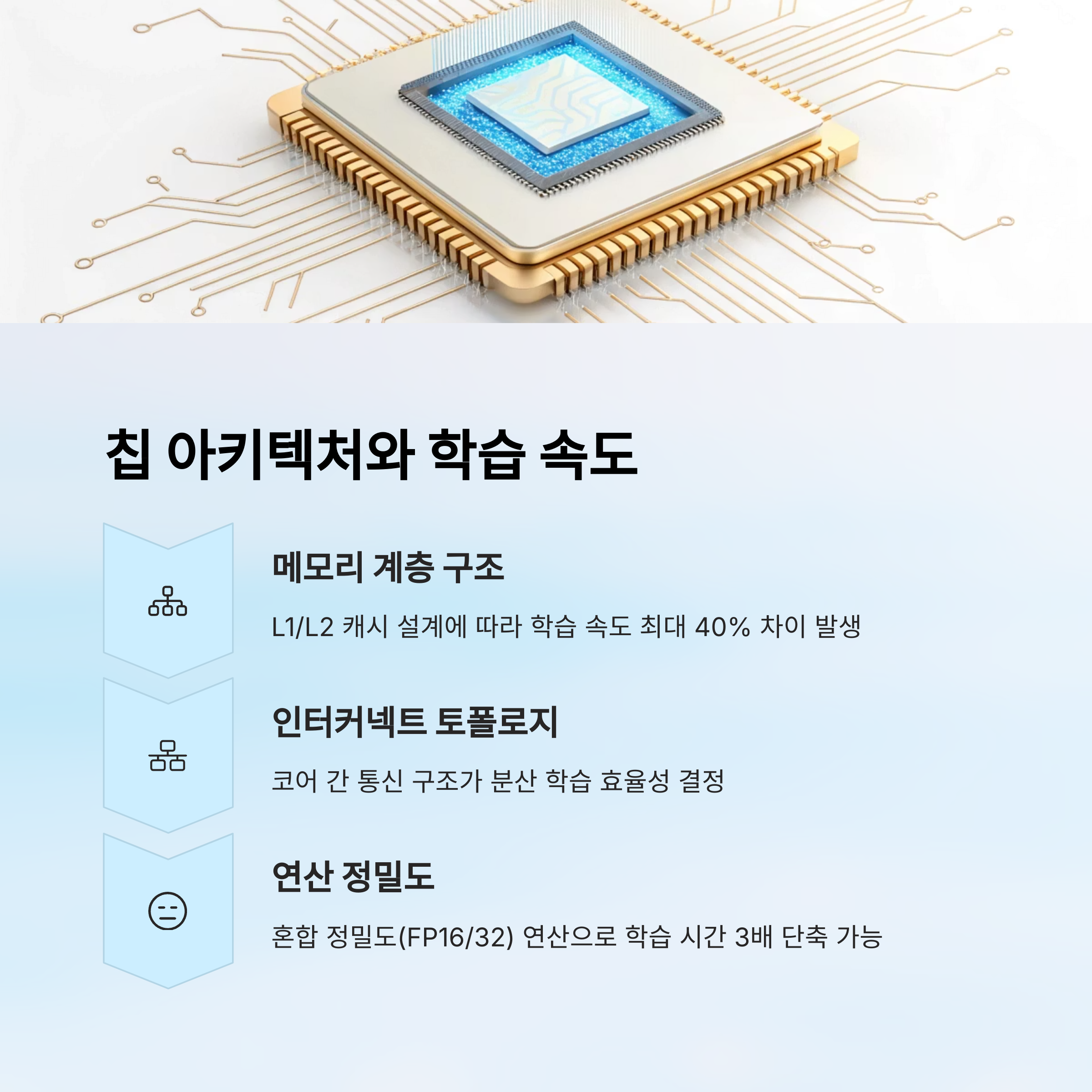 - 파이프라인 최적화: 연산과 메모리 액세스를 효율적으로 파이프라인화하는 구조는 대기 시간을 줄여 전체 학습 속도를 높입니다. 최신 칩들은 이런 파이프라인 최적화에 많은 공을 들이고 있어요.