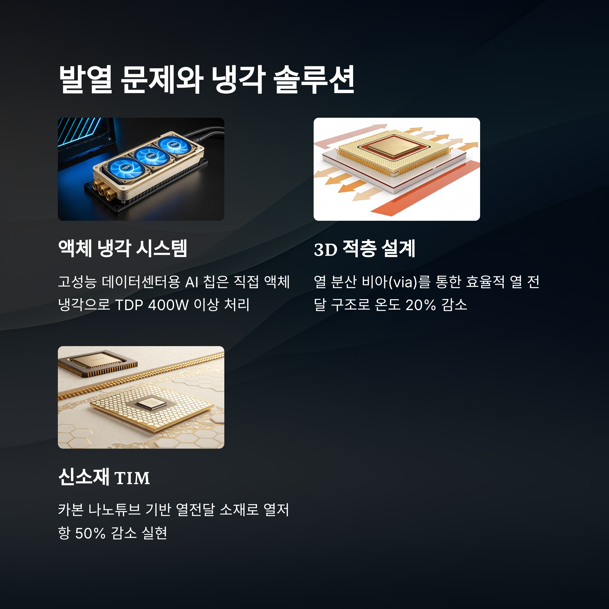 AI 칩 이야기를 하면서 발열 문제를 빼놓을 수 없어요. 고성능 AI 칩은 엄청난 열을 발생시키는데, 이 열을 효과적으로 제거하지 못하면 칩은 스스로를 보호하기 위해 클럭 속도를 낮추게 되고(스로틀링), 결국 성능이 크게 저하됩니다.