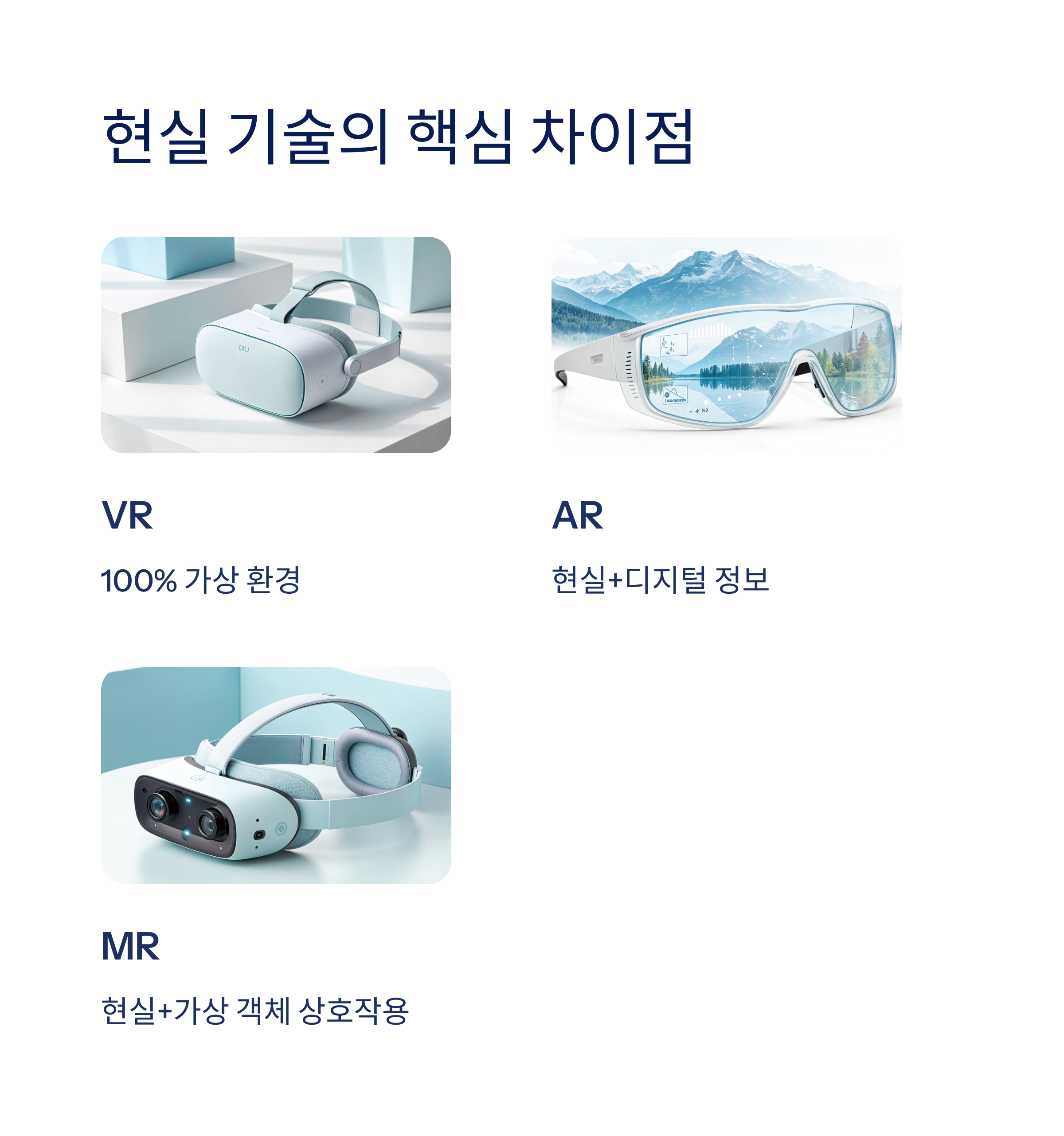 | 대표 기기 | 메타 퀘스트, PSVR | 스마트폰, 구글 글래스 | 홀로렌즈, 매직 립 | 애플 비전 프로 |