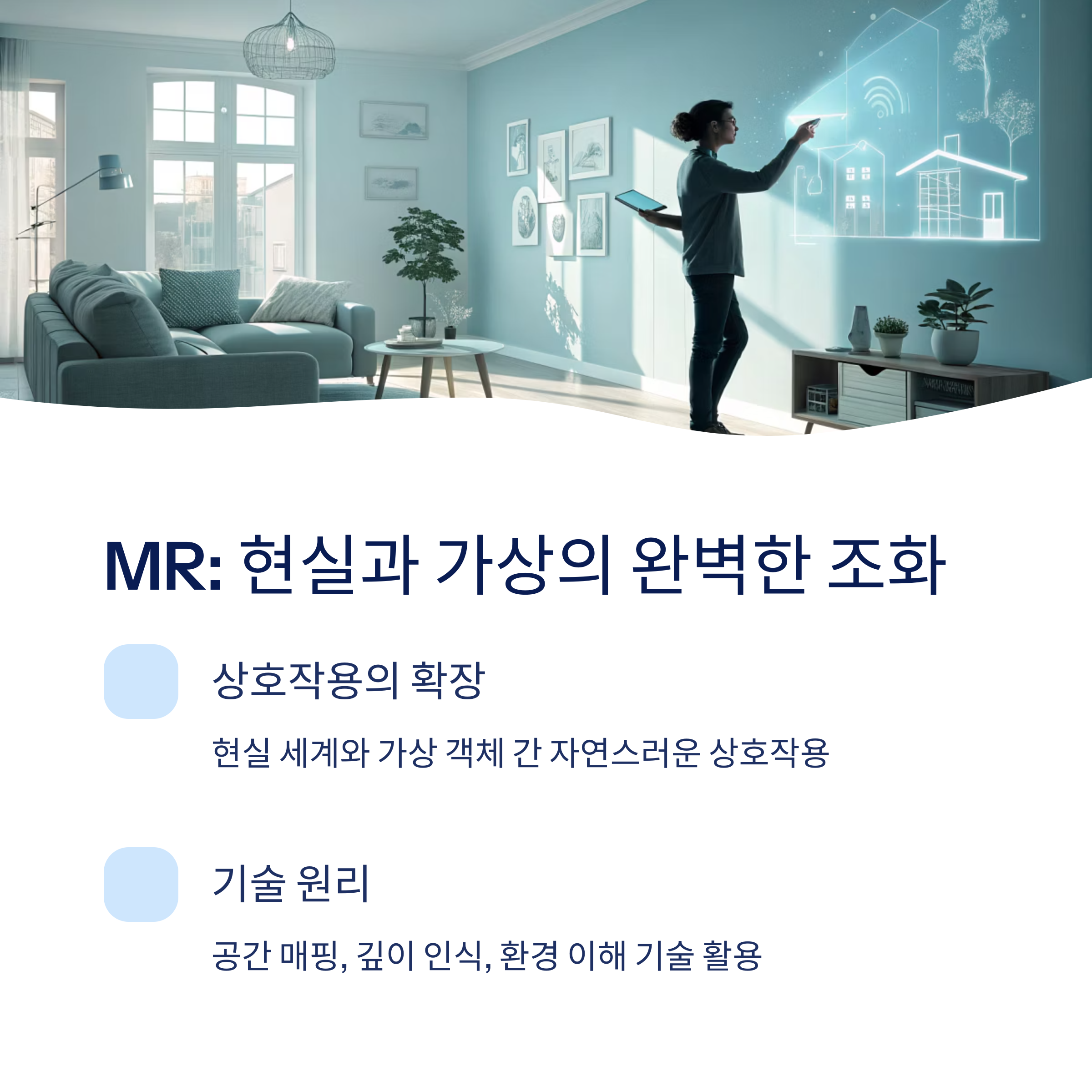 AR이 단순히 현실 위에 정보를 덧입히는 수준이라면, MR은 가상 객체가 현실 세계와 실제로 상호작용합니다. 예를 들어, 가상의 공이 실제 테이블 위에서 튀거나, 가상의 캐릭터가 실제 벽 뒤에 숨는 등의 경험이 가능해요. 이를 위해 MR 기기는 주변 환경을 정밀하게 스캔하고 매핑하는 기술이 필요하죠.